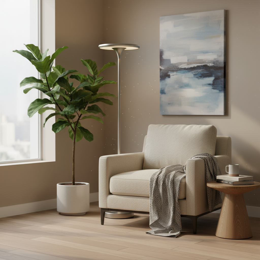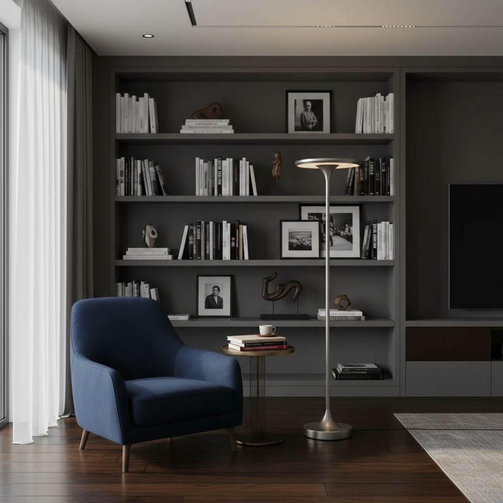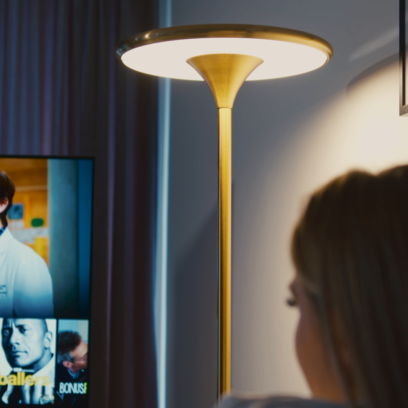 Vi har skabt vores smukke gulvlampe med ønsket om at bringe hyggelig og stemningsfuld belysning ind i alle hjørner af dit hjem. Placer den for eksempel: